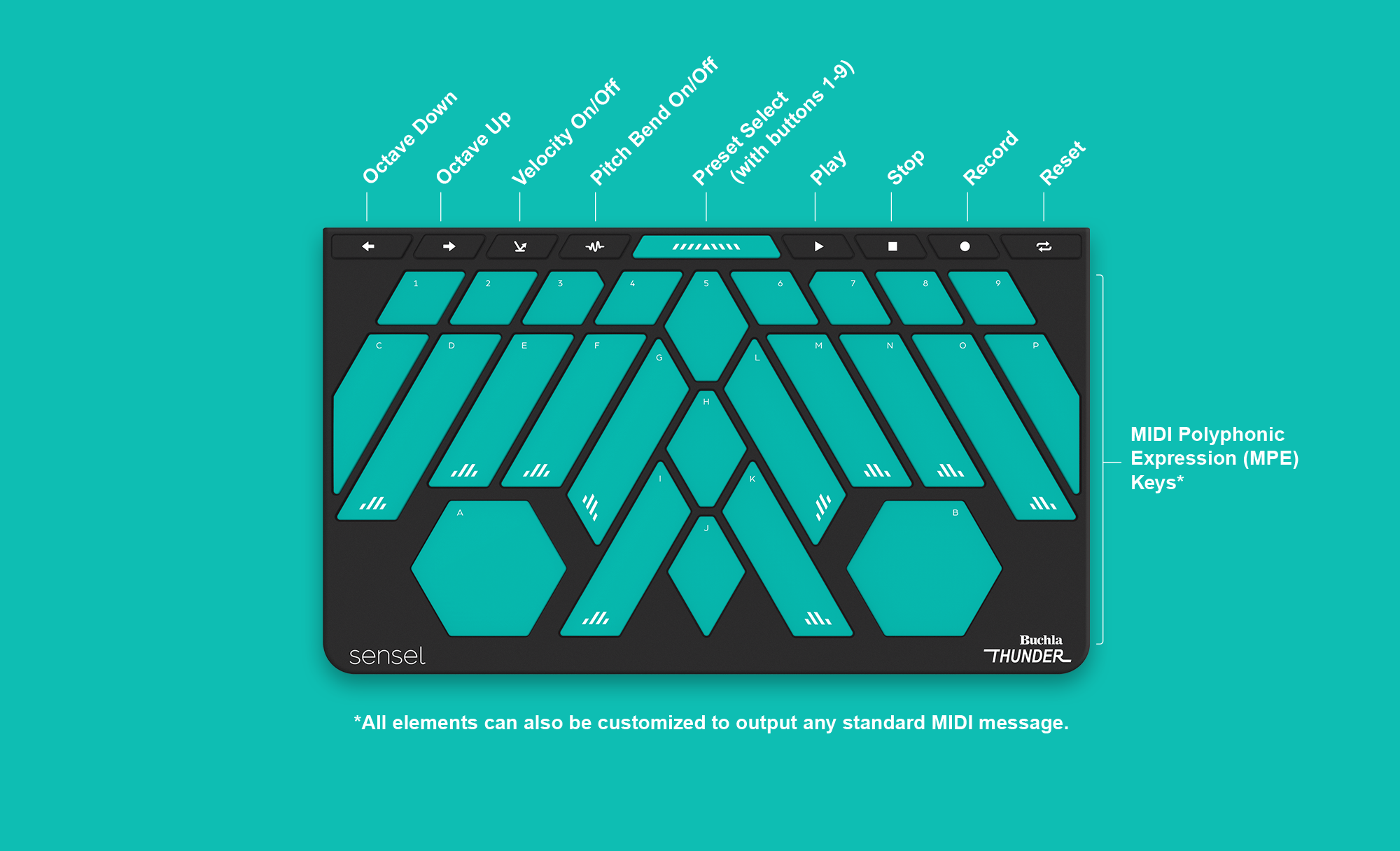 With 27 dedicated areas that transmit MIDI or MPE input, the Buchla Thunder Overlay offers unparalleled expressive control, and I am proud to have been a part of creating an instrument that puts play back into music. The Overlay is exclusively native to MPE and features a new preset system that enables instant switching between nine mappings without needing to open the SenselApp.