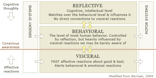 In his book "Emotional Design," Donald Norman outlined three distinct levels of experience that can be elicited by different types of design: Visceral Design, Behavioural Design and Reflective Design.
