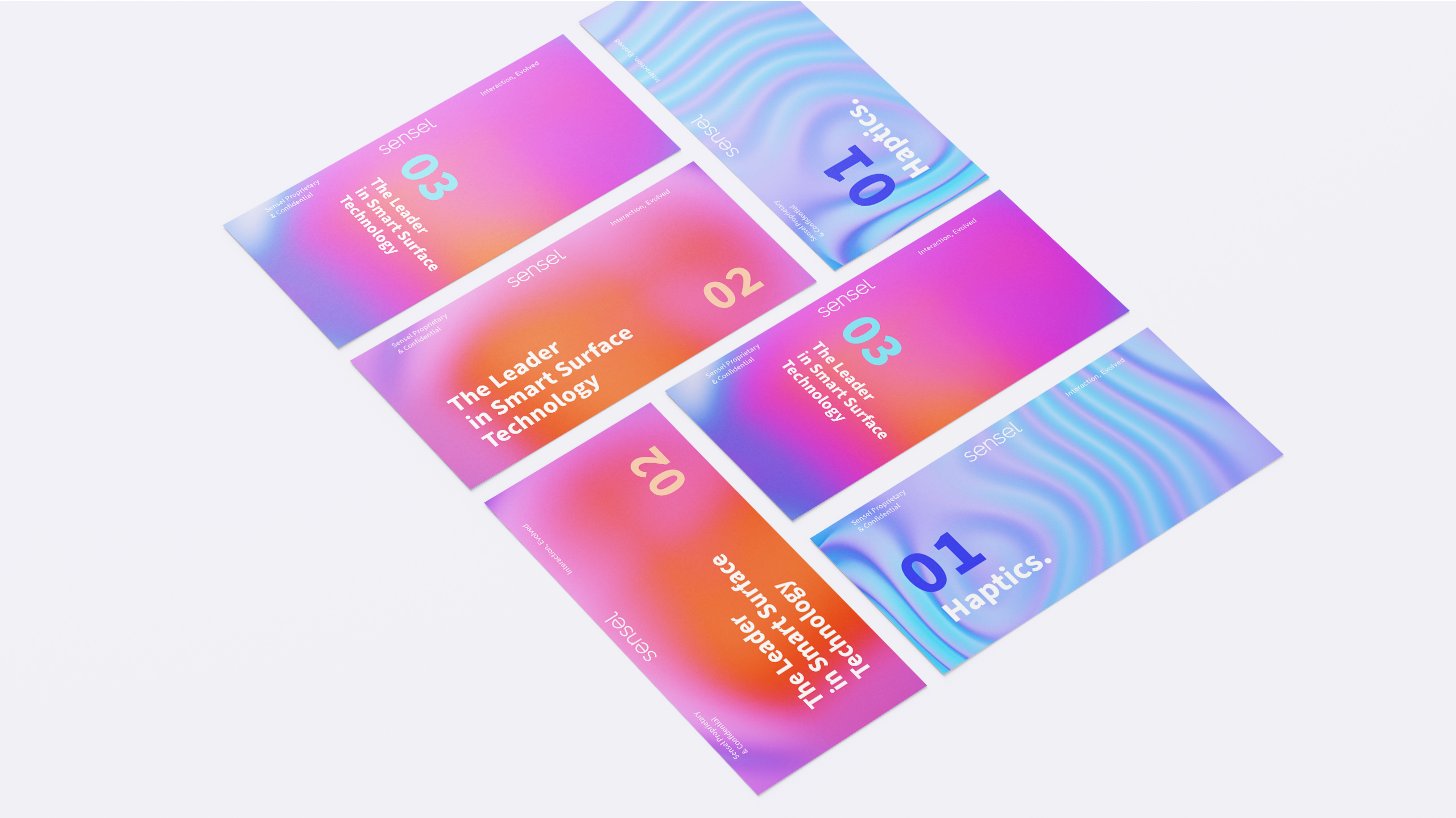 The spirit of the original logo's amorphous shape is preserved, conveying a message of being unbounded, while the curvy surface suggests a touch or multiple touches from below. By increasing the waviness of the surface, I effectively imbued the branding system with a sense of vibration and introduced the element of haptics, a technology which Sensel is actively developing but has not yet incorporated into its visual system.